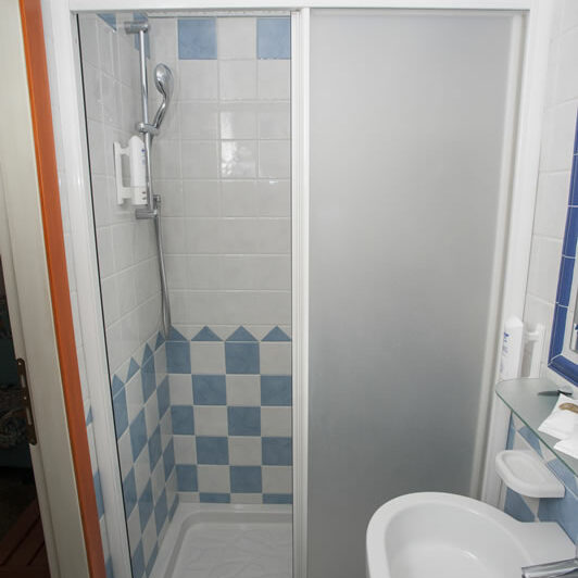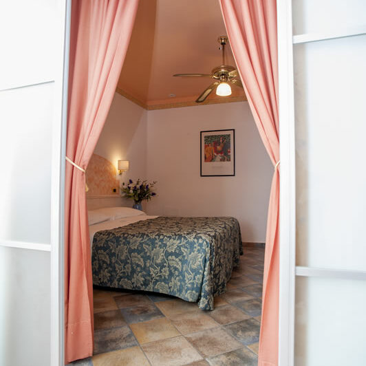 Schiebetüren aus Milchglas trennen den Wohnbereich vom Schlafzimmer mit Doppelbett, geschlossenem Badezimmer mit Dusche und Haartrockner.