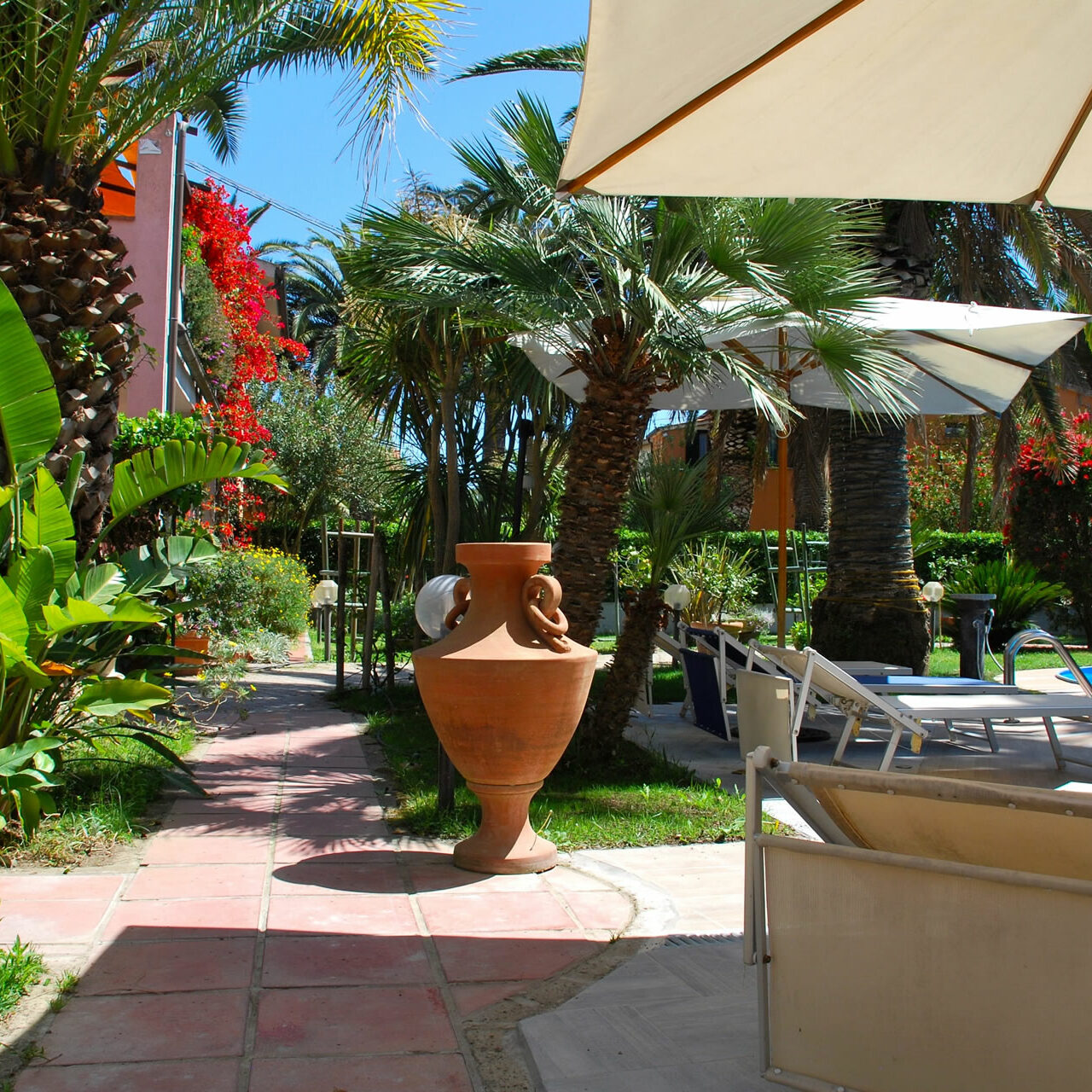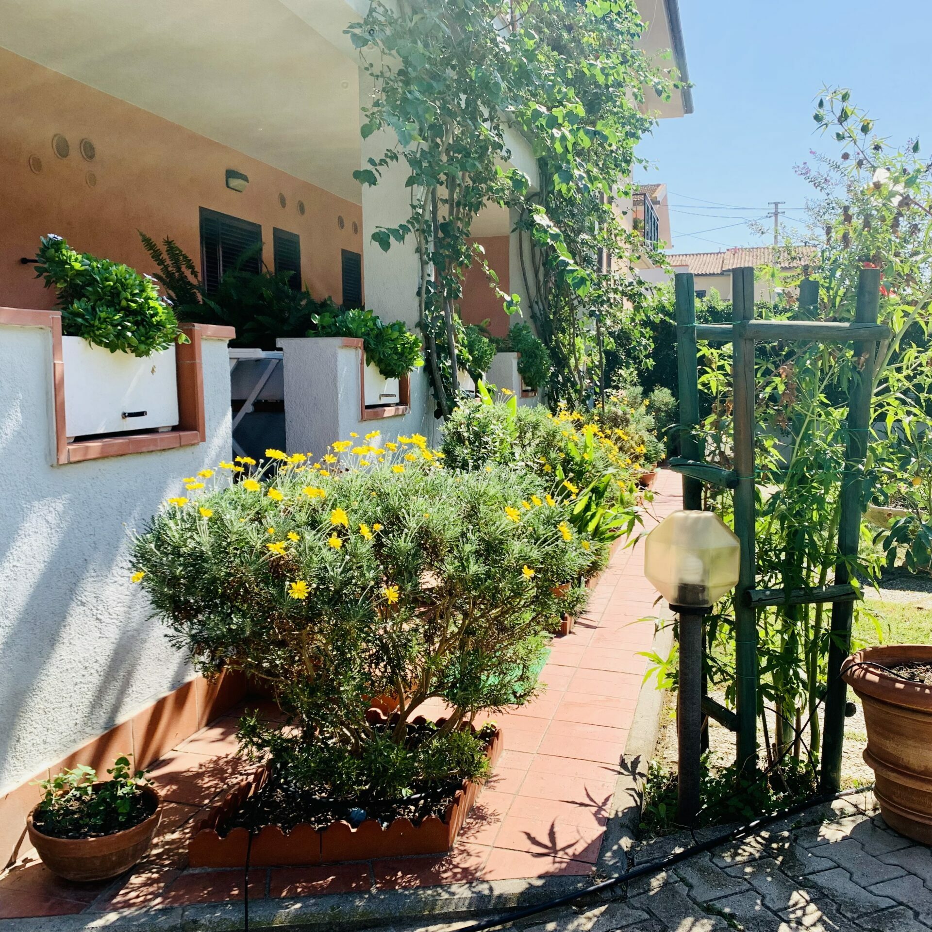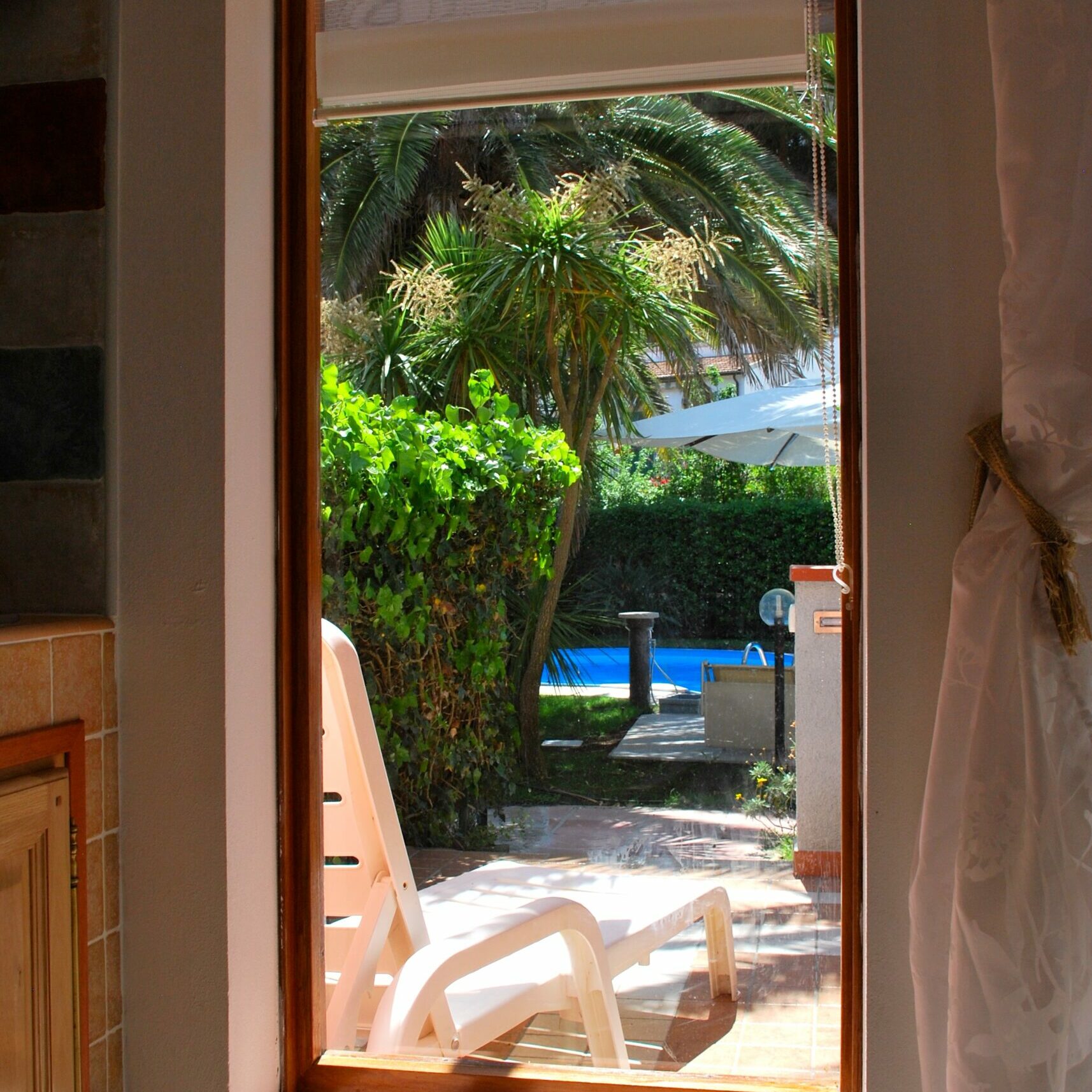 Sie befinden sich im Erdgeschoss mit Blick auf den Poolgarten.