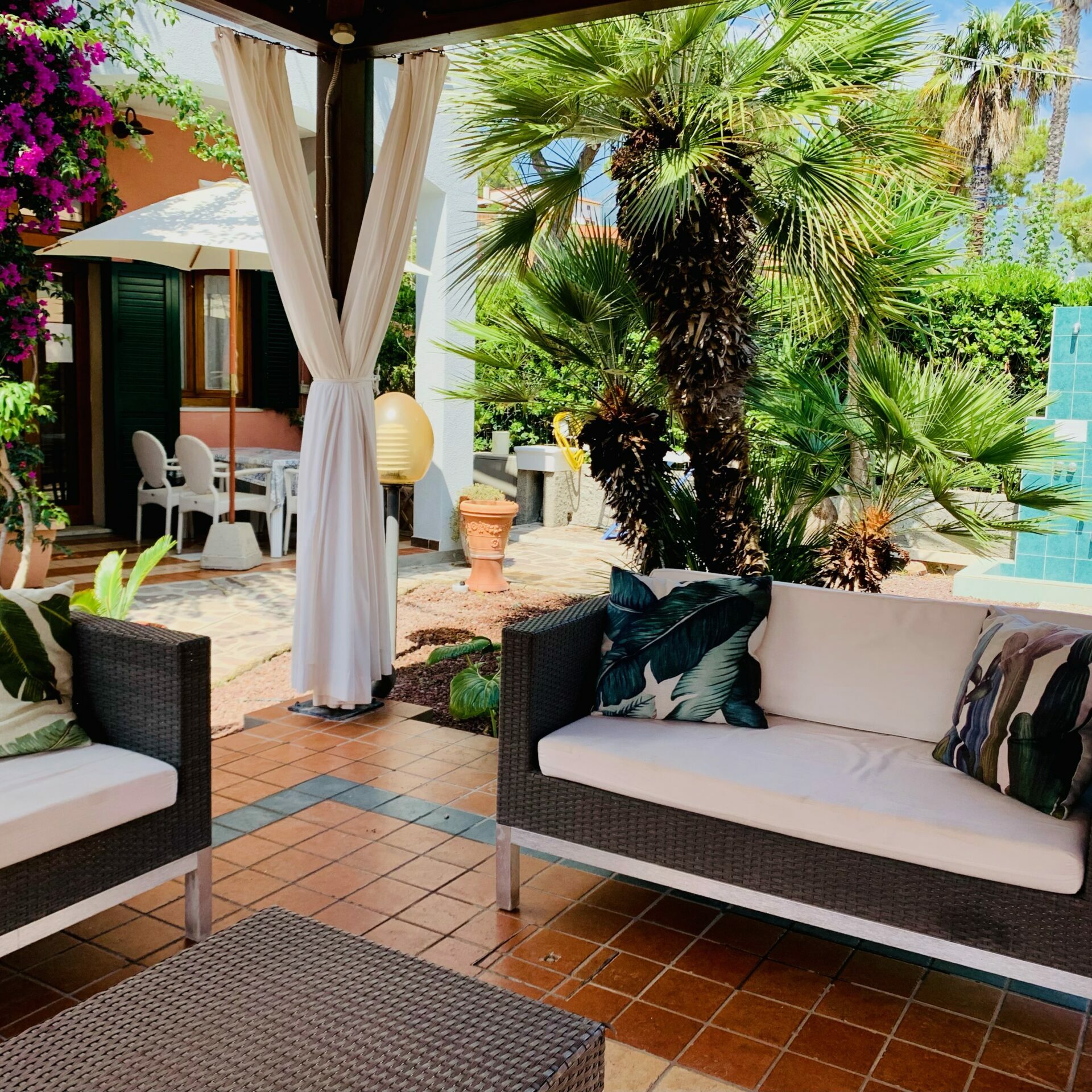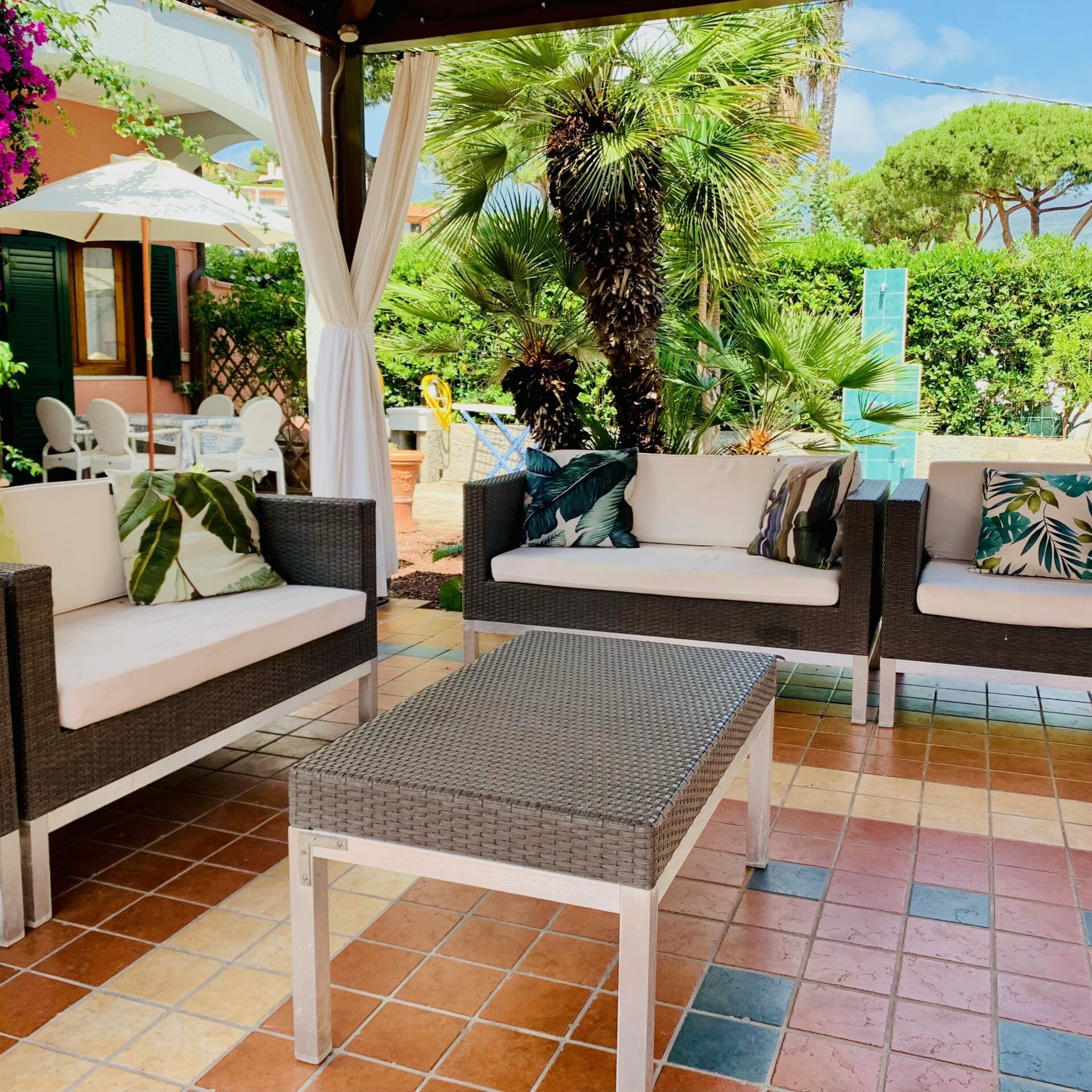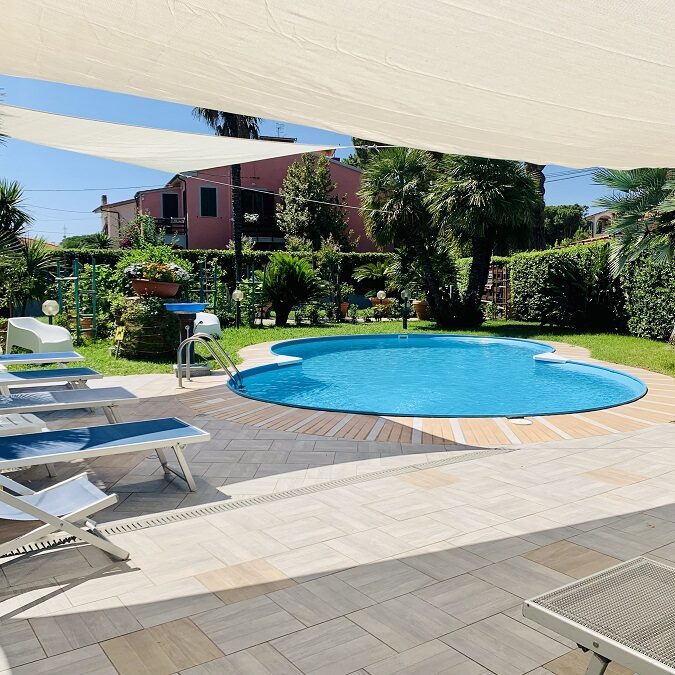 On the other side of the road instead we have another building with standard hotel rooms. In this garden you will also find a gazebo which can be used to relax and read or watch TV programmes. The soft cushioned sofas invite you to relax in the evening as the temperature cools outside. The gazebo then leads on to the Residence dei Fiori and a secondary exit onto Viale degli Etruschi which leads to the beach.